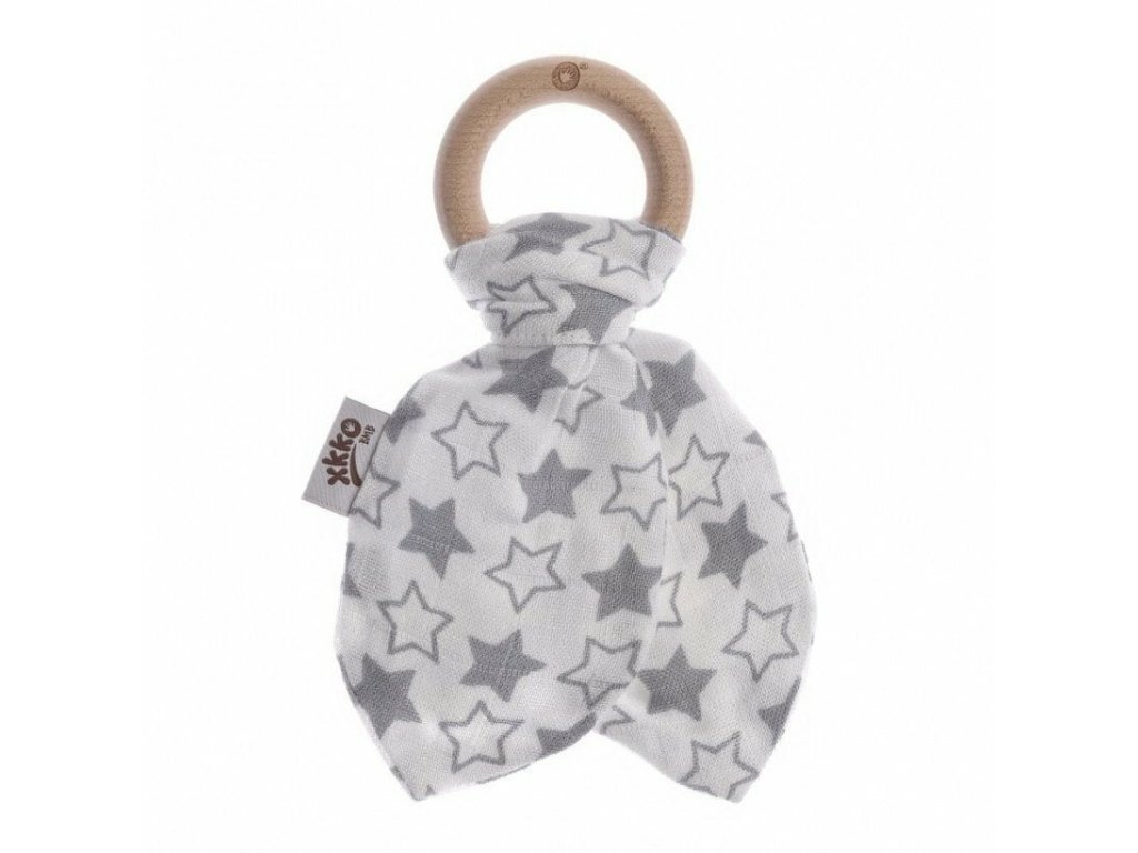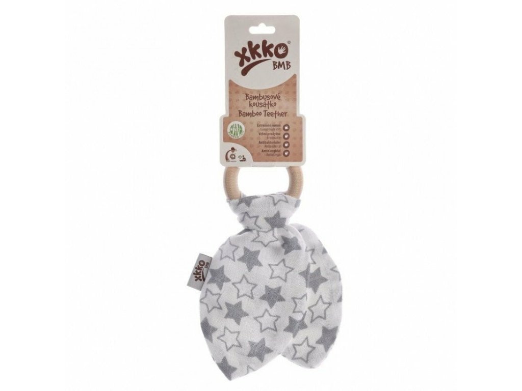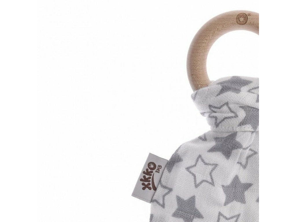 Drevené hryzátko XKKO BMB so šuštivými lístkami z extrémne jemného bambusového mušelínu. Bambusová viskóza je antibakteriálna a nespôsobuje žiadnu alergickú reakciu.